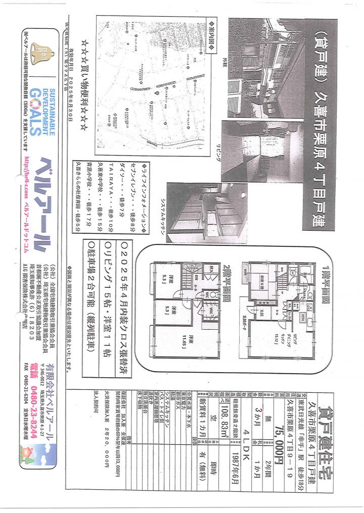 東武日光線幸手駅 徒歩 18分 | 久喜市栗原4-9-19 | 4 LDK | 108.83㎡ | 1987年06月 | 75,000円 | 225,000 75000 |