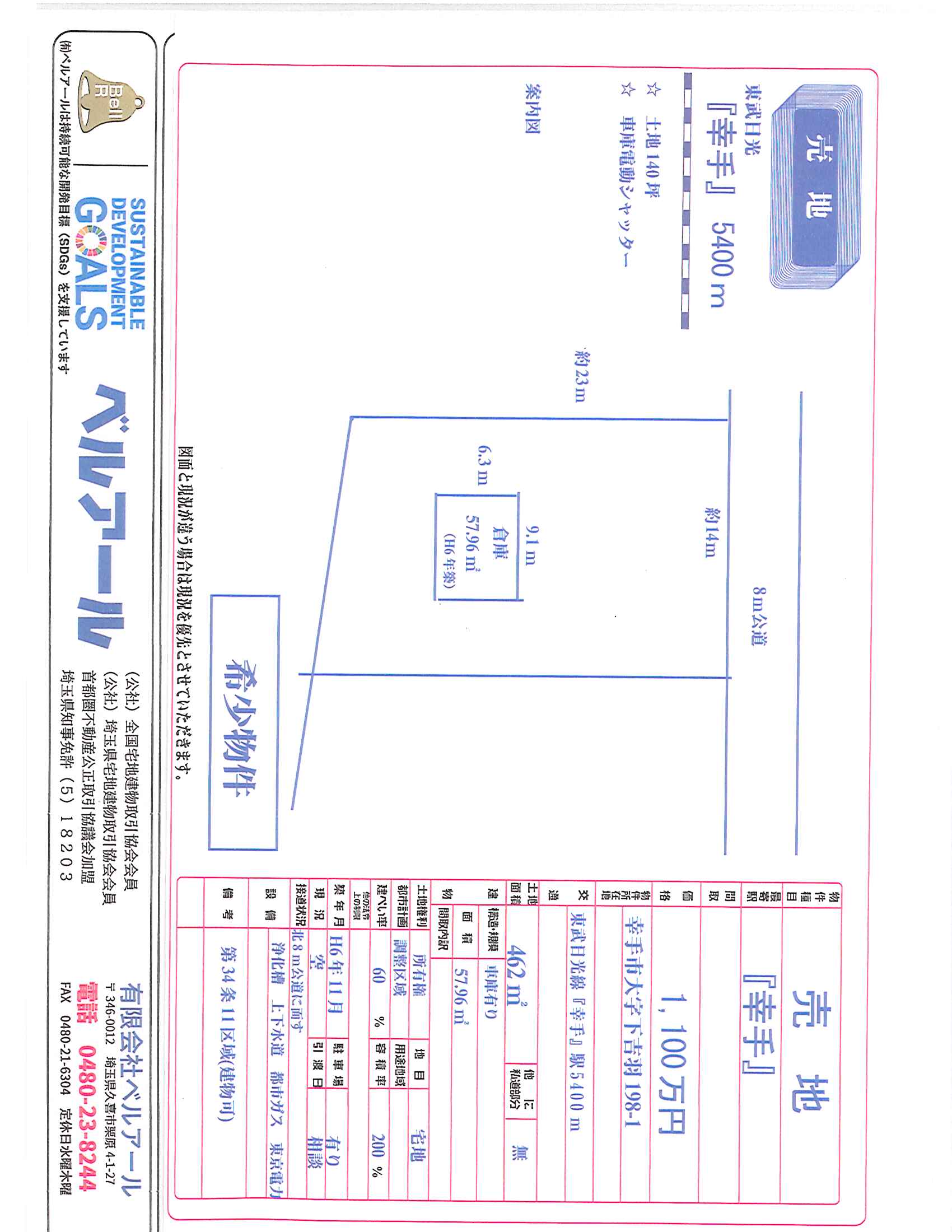 東武日光線幸手駅 徒歩 5400分 | 幸手市大字下吉羽198-1 | 土地/462㎡ | 1,100万円(税込) |