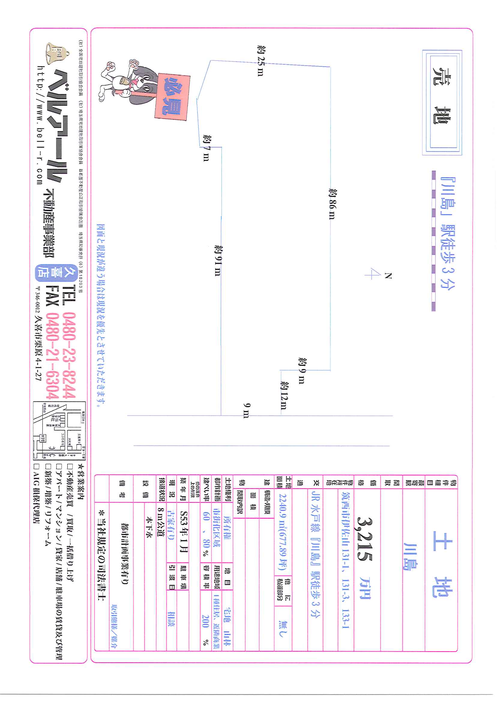 水戸線 川島駅 徒歩 3分 | 茨城県筑西市伊佐山131-1、131-3茨城県、133-1 | 土地/2240.9㎡ | 2,604万円(税込) |