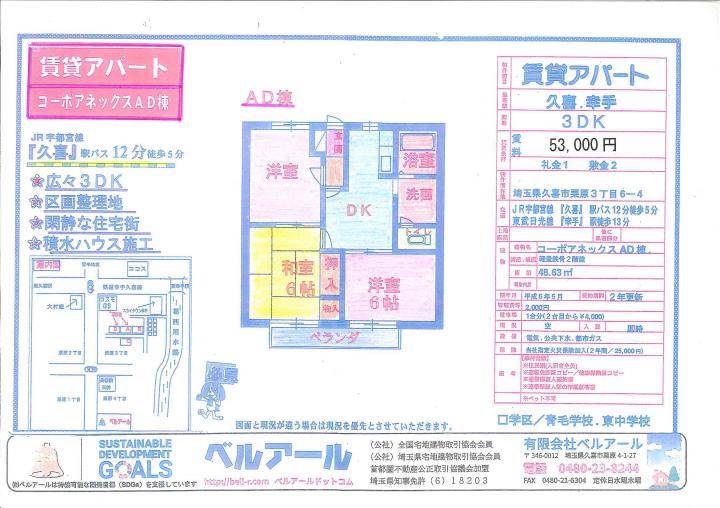 JR東北線 久喜駅 バス 13分 | 久喜市栗原3-6-4 | 3 DK | 48.63㎡ | 1994年05月 | 53,000円 | 103000 53000 |