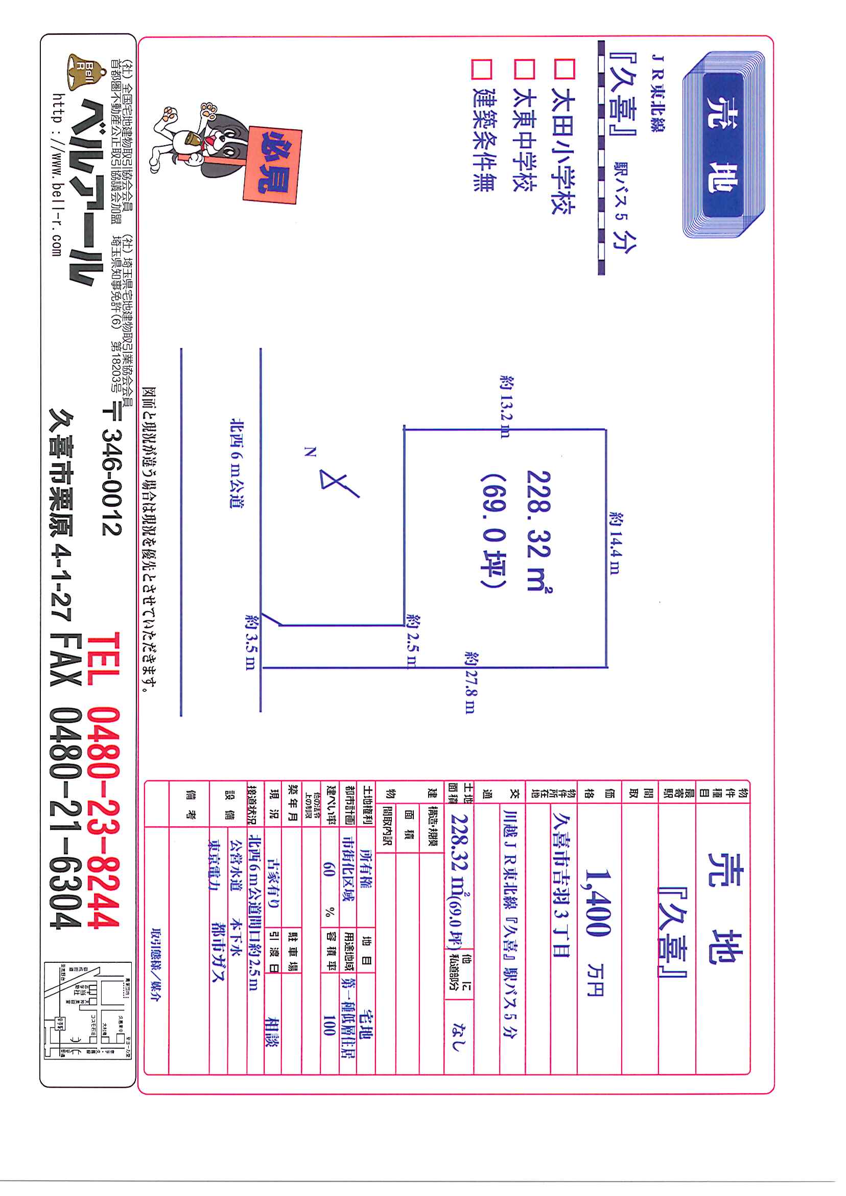 JR東北線 久喜駅 バス 5分 | 久喜市吉羽3丁目 | 土地/228.32㎡ | 1,400万円(税込) |