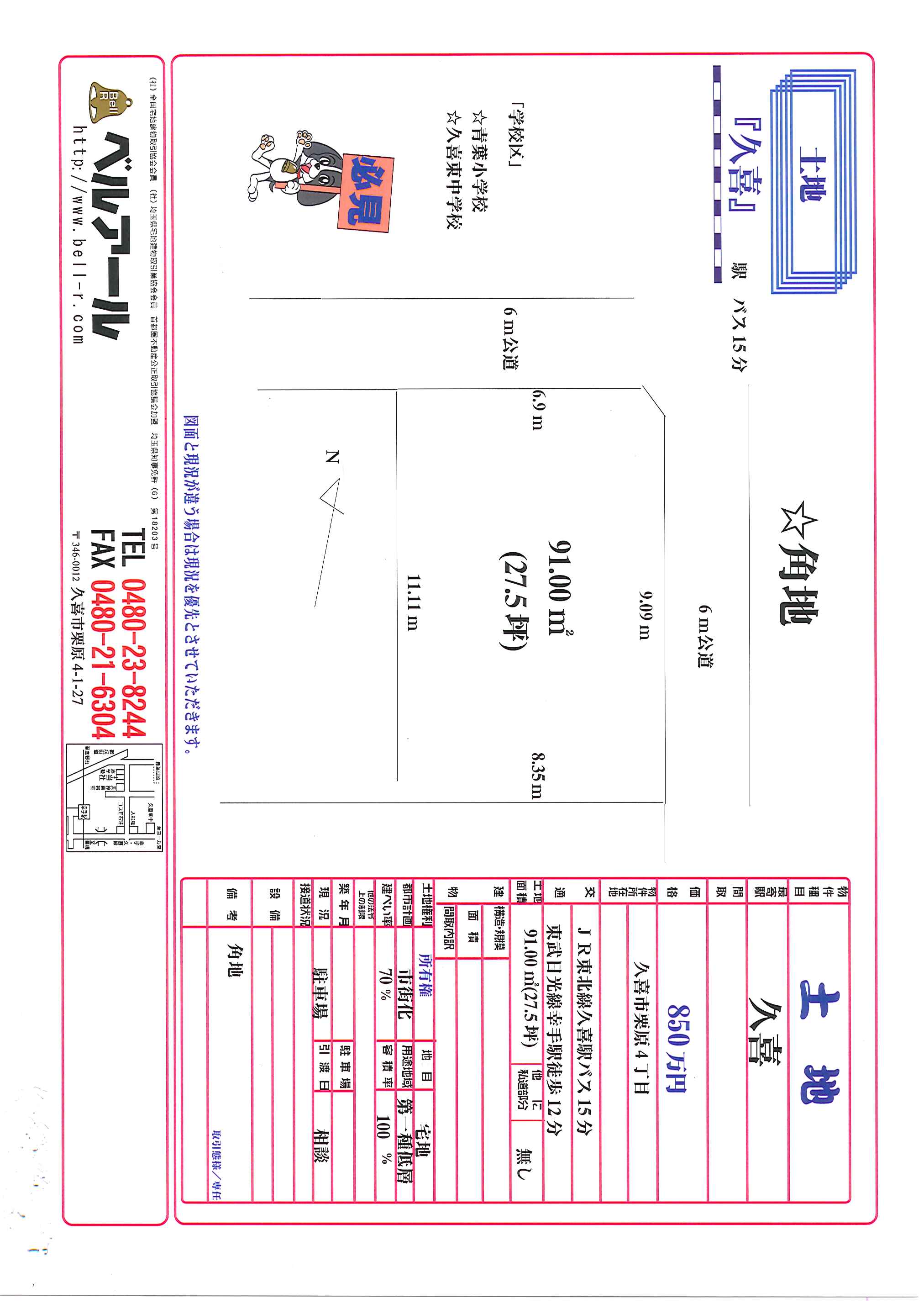 JR東北線 久喜駅 バス 13分 | 久喜市栗原4-6-14 | 土地/91.00㎡ | 2025年09月 | 850万円(税込) |